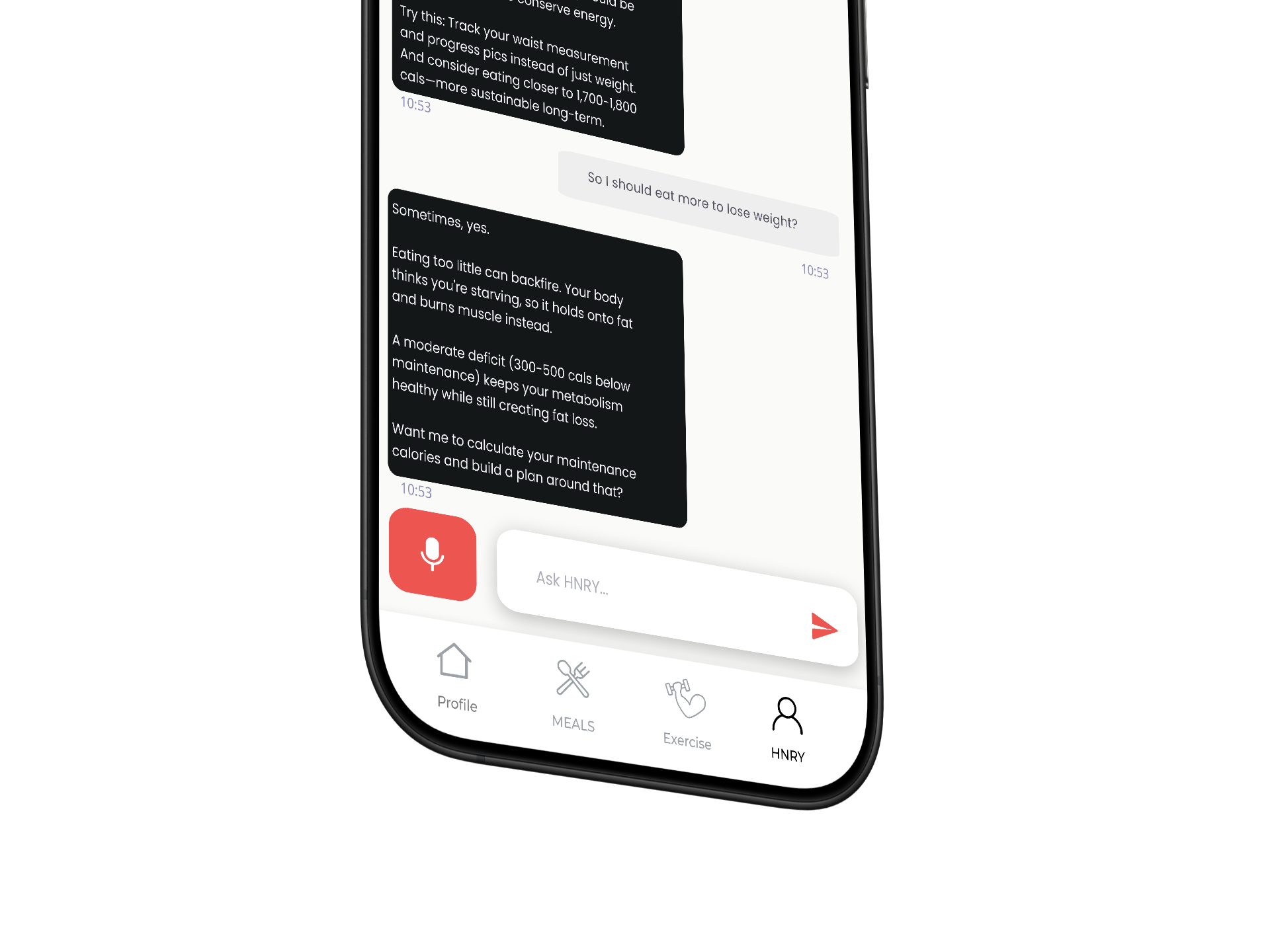 Confused about macros? Not sure if you're doing an exercise right? Just ask HNRY. It's like having a trainer in your pocket—available 24/7, no judgment.